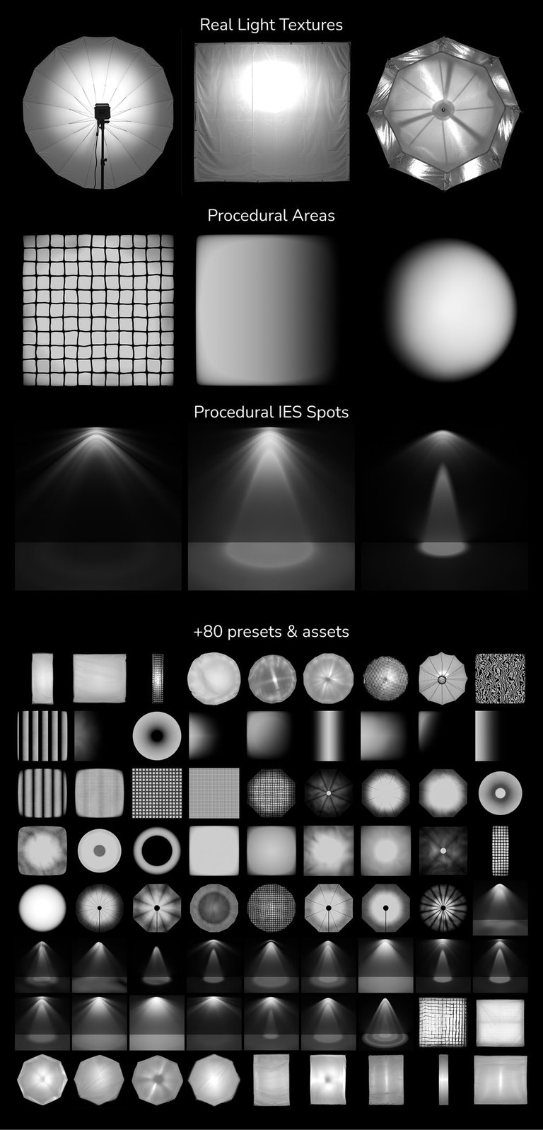 In some scenarios you may want to add some extra imperfections as the real studio lights do. This pack include a set of them ready to be used + many area and spotlight presets we created as starting points for the procedural versions.